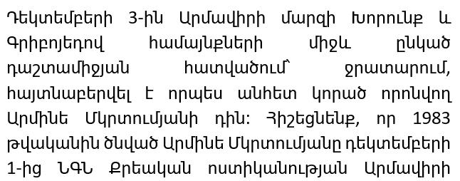 On December 3, in the interfield area between the communities of Khorunk and Griboyadov, Armavir region, in the water canal, the body of Armine Mkrtumyan was discovered,