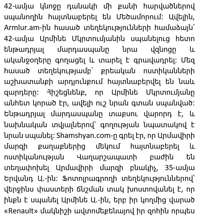 In Metsamor they found a man who, according to investigators, was involved in the murder of a 42-year-old woman. According to information received by Armlur.am, after the murder of Armine Mkrtumyan, the suspect took her jewelry — a chain and earrings — and
