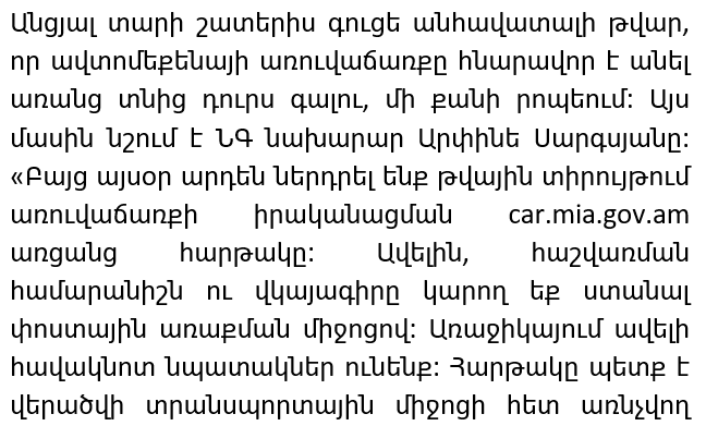 online platform car.mia.gov.am for making purchase and sale transactions in the digital environment. Moreover, you can receive registration numbers and a certificate of registration by postal delivery. We have even more coming soon