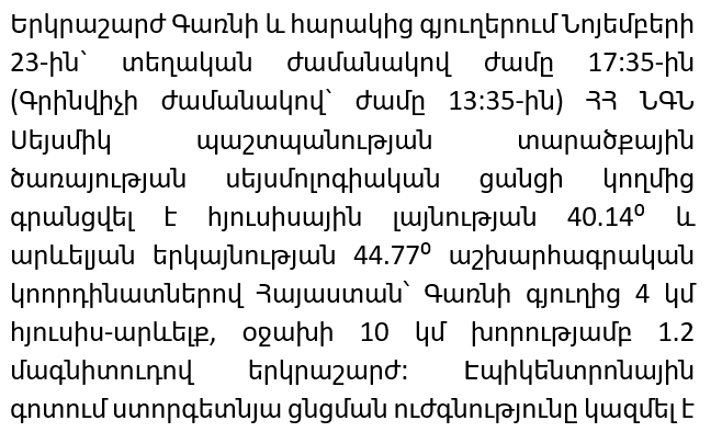 Earthquake in Garni and neighboring villages on November 23 at 17:35 local time (13:35 GMT) seismological network of the Territorial Service