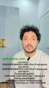 Նվիրատվություն ցանկացողները կարող են օգտվել հետևյալ տվյալներից․ Inecobank (AMD) – 2050155824681001 (Գոռ Հակոբյան) Inecobank (USD) – 2050155824687020 (Gor Hakobyan) Բանկային քարտ – 5406 6100 0460 4943 (Gor Hakobyan) Արագ փոխանցումներ – Money Gram, Intel Express (EUR, USD, RUB) Տեղեկության տարածումը նույնպես կարող է մեծ օգնություն լինել։